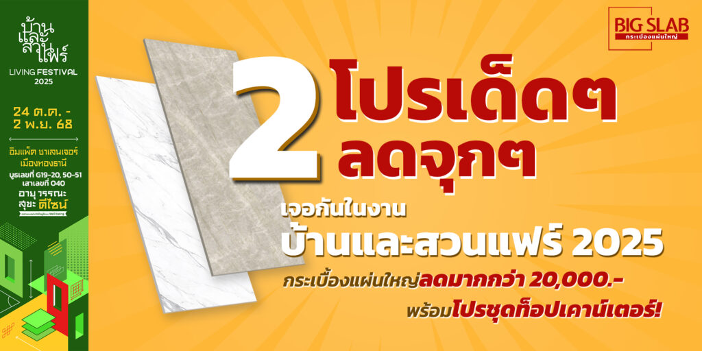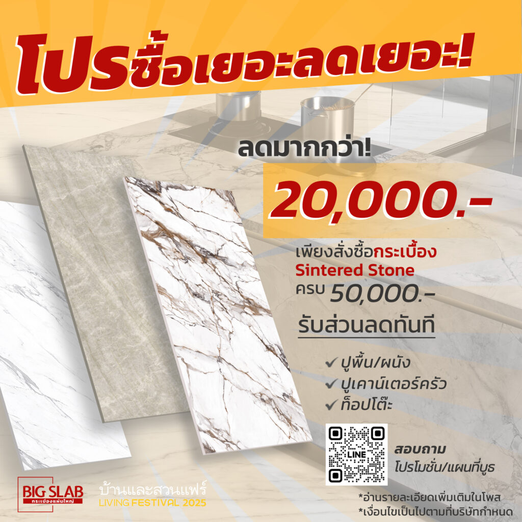 1. ‘โปรซื้อเยอะลดเยอะ’ ลดมากกว่า 20,000.-! เพียงสั่งซื้อกระเบื้อง Sintered Stone ลายใดก็ได้ ครบทุก 50,000.-/ออเดอร์ รับส่วนลดทันที 20,000.-
