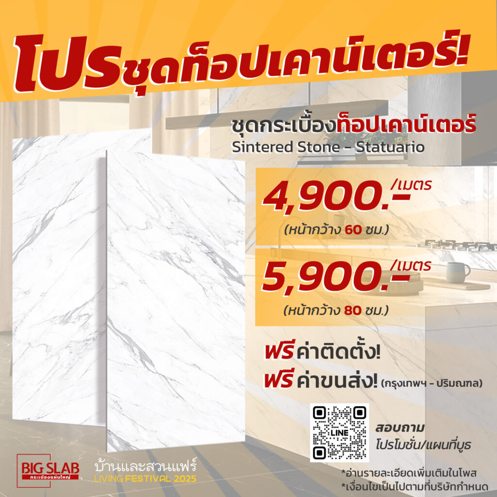 2. ‘โปรชุดกระเบื้องท็อปเคาน์เตอร์’ โปรชุดเซ็ตสุดคุ้ม เพียง 4,900.-/เมตร (หน้ากว้าง 60 ซม.) และ 5,900.-/เมตร (หน้ากว้าง 80 ซม.) เฉพาะ Sintered Stone ลาย Statuario พิเศษ ฟรี!ค่าติดตั้ง ฟรี!ค่าขนส่ง